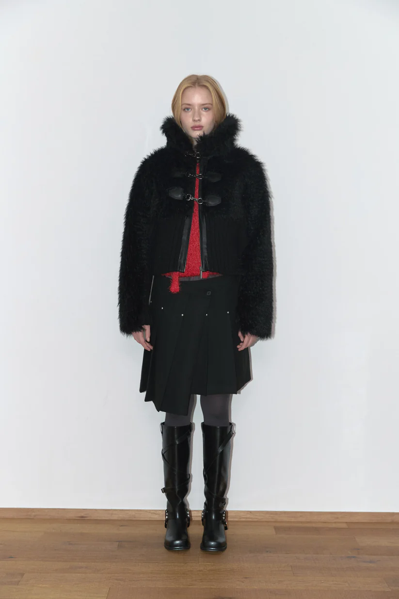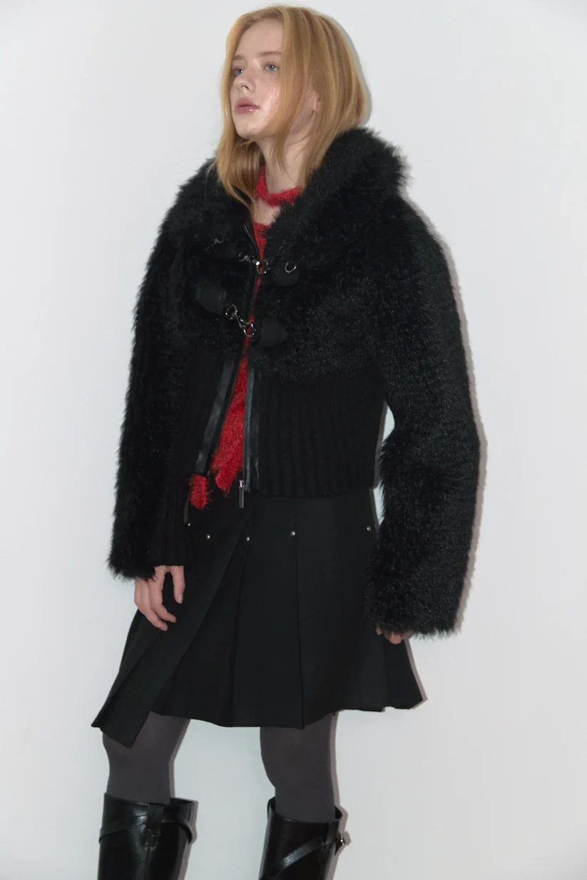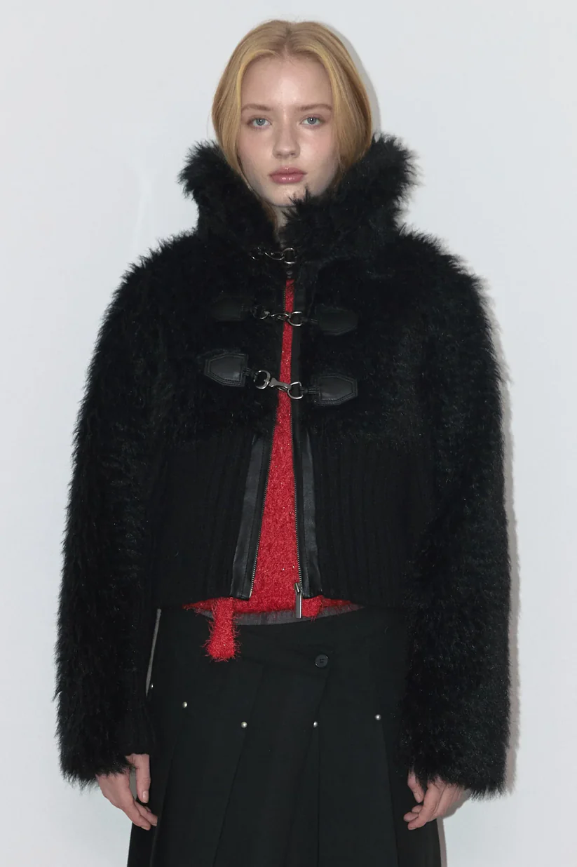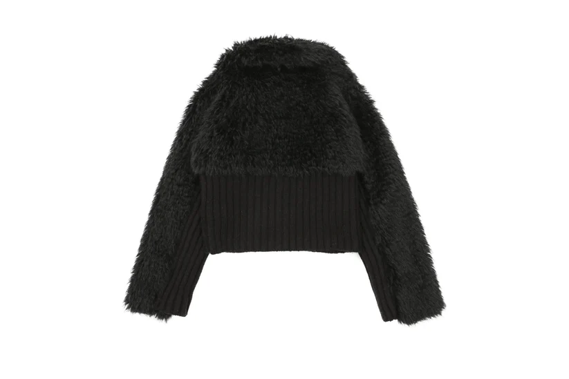 The soft and voluminous faux fur serves as a key highlight, while the knit sections on the inner sleeves and hem provide a structured fit for added comfort.