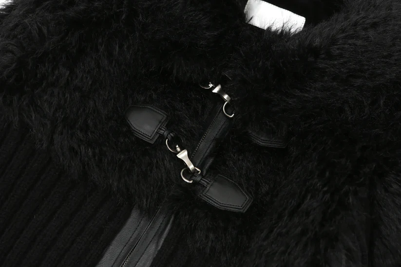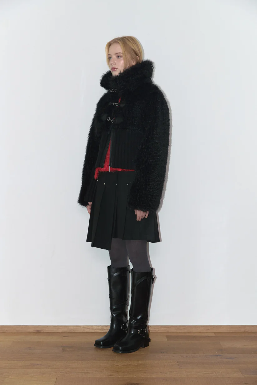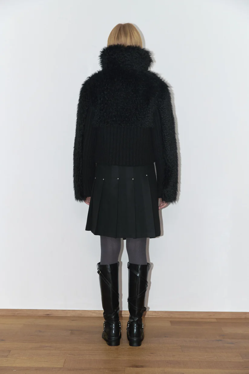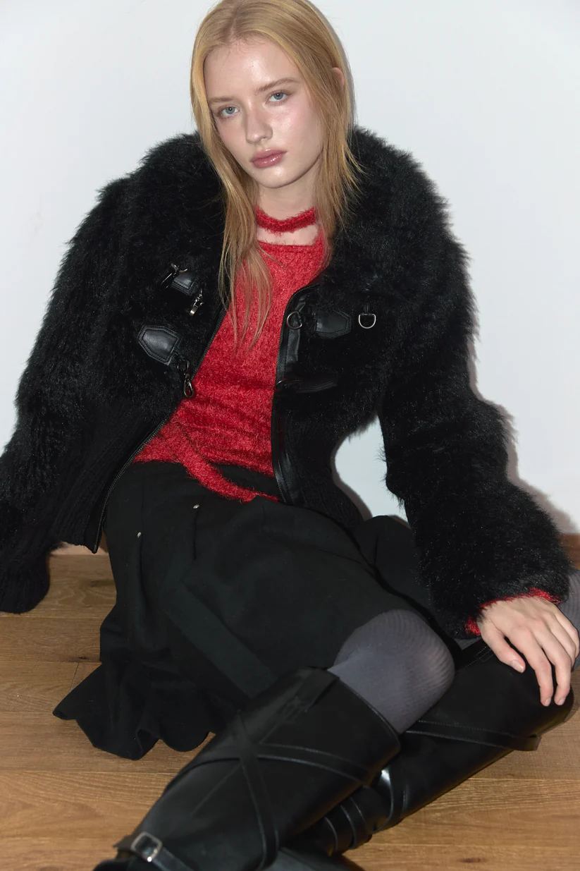 The soft and voluminous faux fur serves as a key highlight, while the knit sections on the inner sleeves and hem provide a structured fit for added comfort.