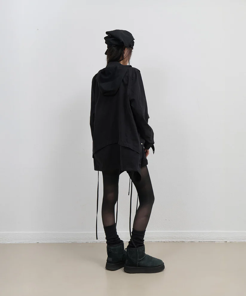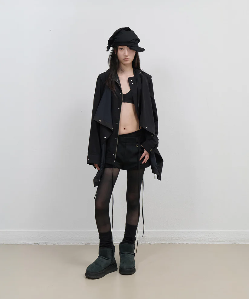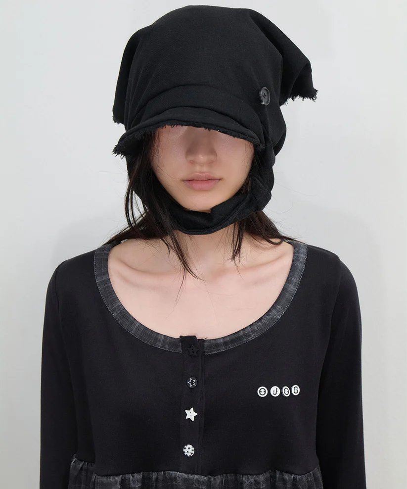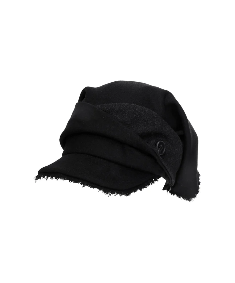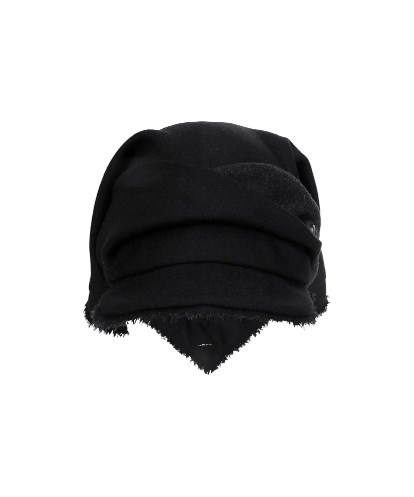 A wool blend cap with a soft draped silhouette and fringe detailing along the peak and edge. The twisted front panel adds subtle structure, while the side OJOS label gives a clean finishing touch. The back features a scarf style extension with a button closure, allowing different ways to wear. The flexible back band provides a comfortable fit across a range of sizes.