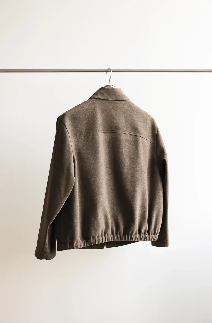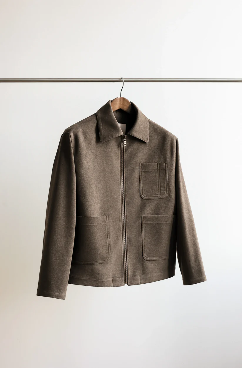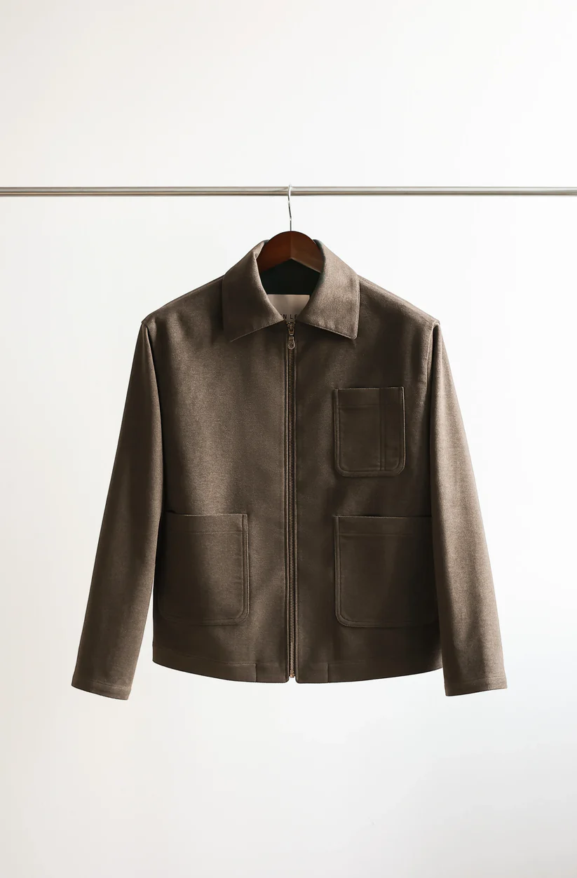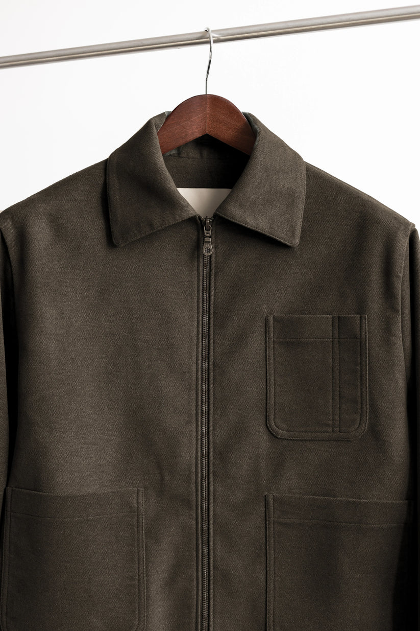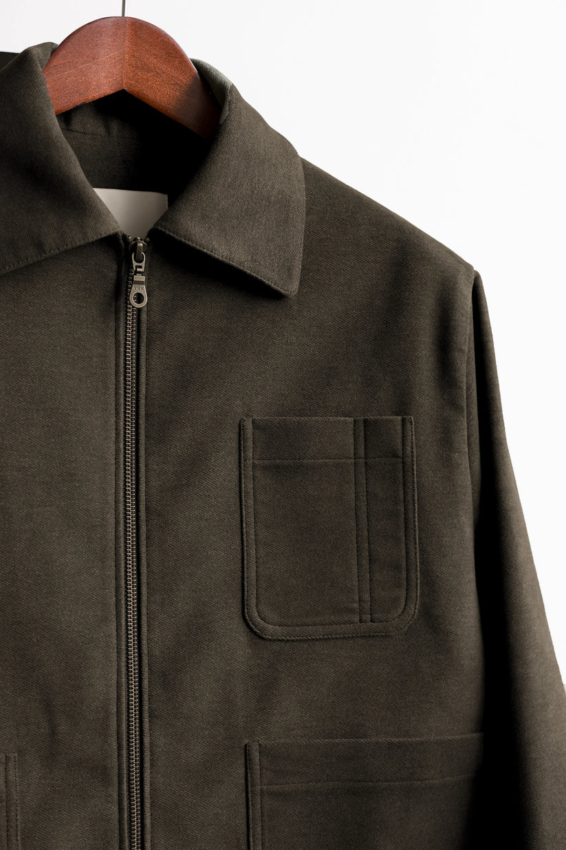 Our take on a minimal utility jacket. A modernised spin on utility or work jackets, this version adds contemporary details such as a full-fronted YKK zip, oversized patch pockets, and a half-elasticated hem while retaining the classic feel of its inspirations.