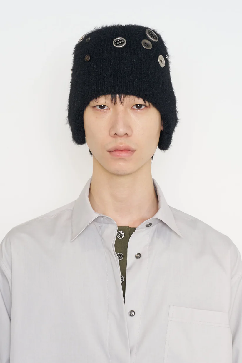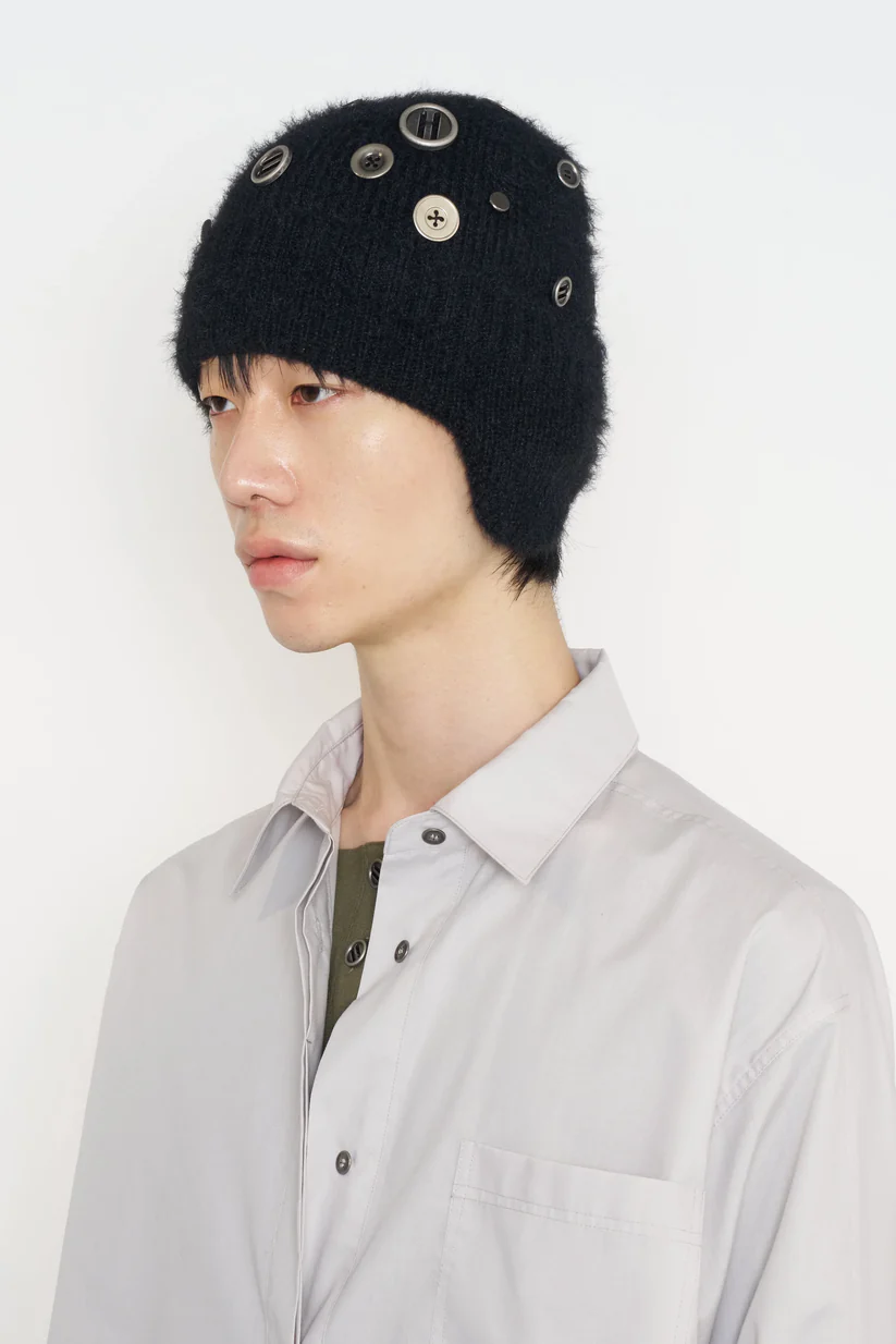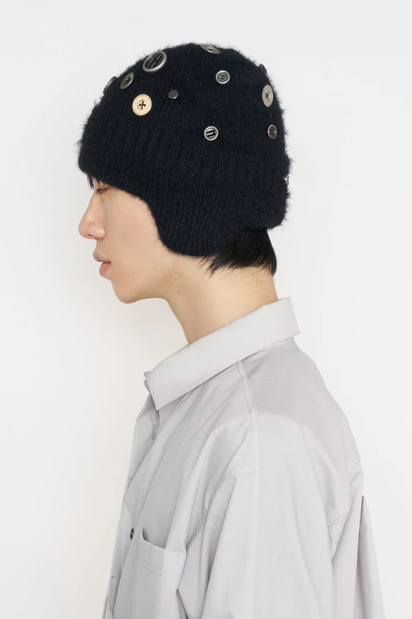 Hand-finished with vintage metal buttons, each piece is uniquely detailed with an asymmetric charm.